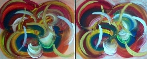 Bijvoorbeeld in dit tweeluik zijn voor een huwelijk subtiel twee trouwringen verwerkt, die op afstand niet opvallen. Komt u dichterbij, dan lopen de twee ringen over van het ene schilderij in het andere. Daarin zijn de namen van de huwelijkskandidaten en trouwdatum verwerkt.